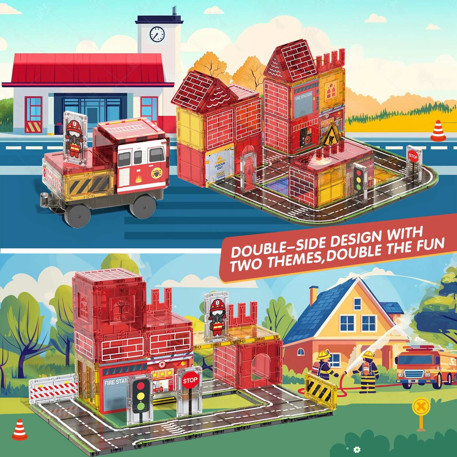 Unlike traditional flat building tiles, our set features dual-sided scene printing that brings the city to life. From realistic brick textures to detailed fire station interiors and local shops, the vibrant graphics are printed directly onto the tiles. This means no peeling stickers and a much more immersive experience for your child.