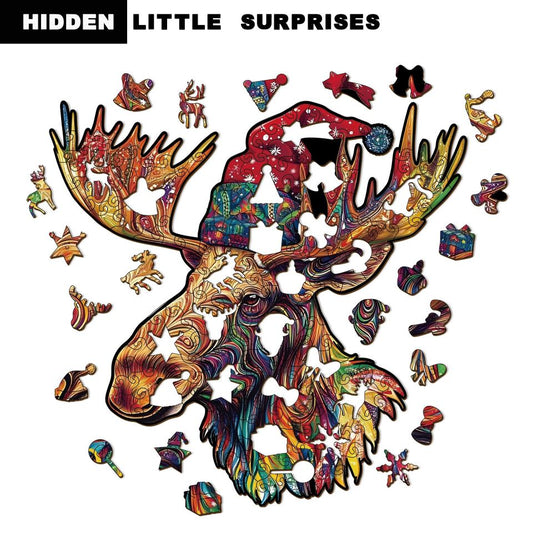 Vibrant Christmas Moose Wooden Jigsaw Puzzle - Abstract Animal Whimsy Pieces
