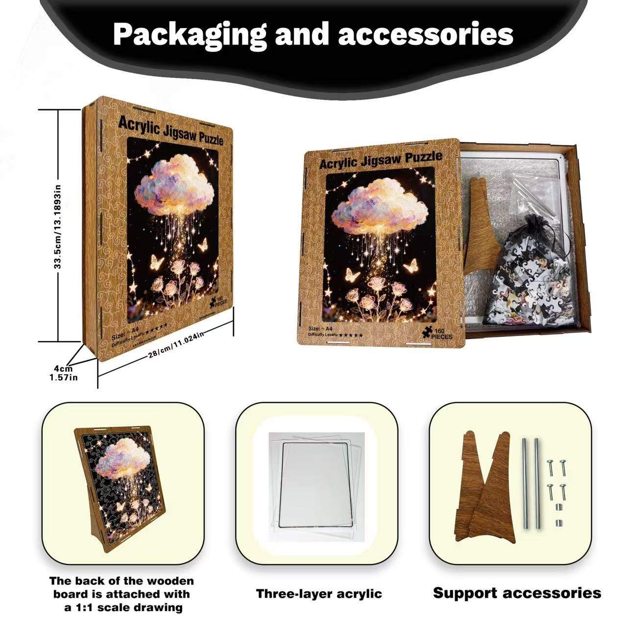 Featuring a glowing pastel cloud, sparkling falling lights, butterflies, and luminous floral artwork, this puzzle becomes even more enchanting under light. Its transparent acrylic design enhances brightness and adds a magical shimmering effect when illuminated.