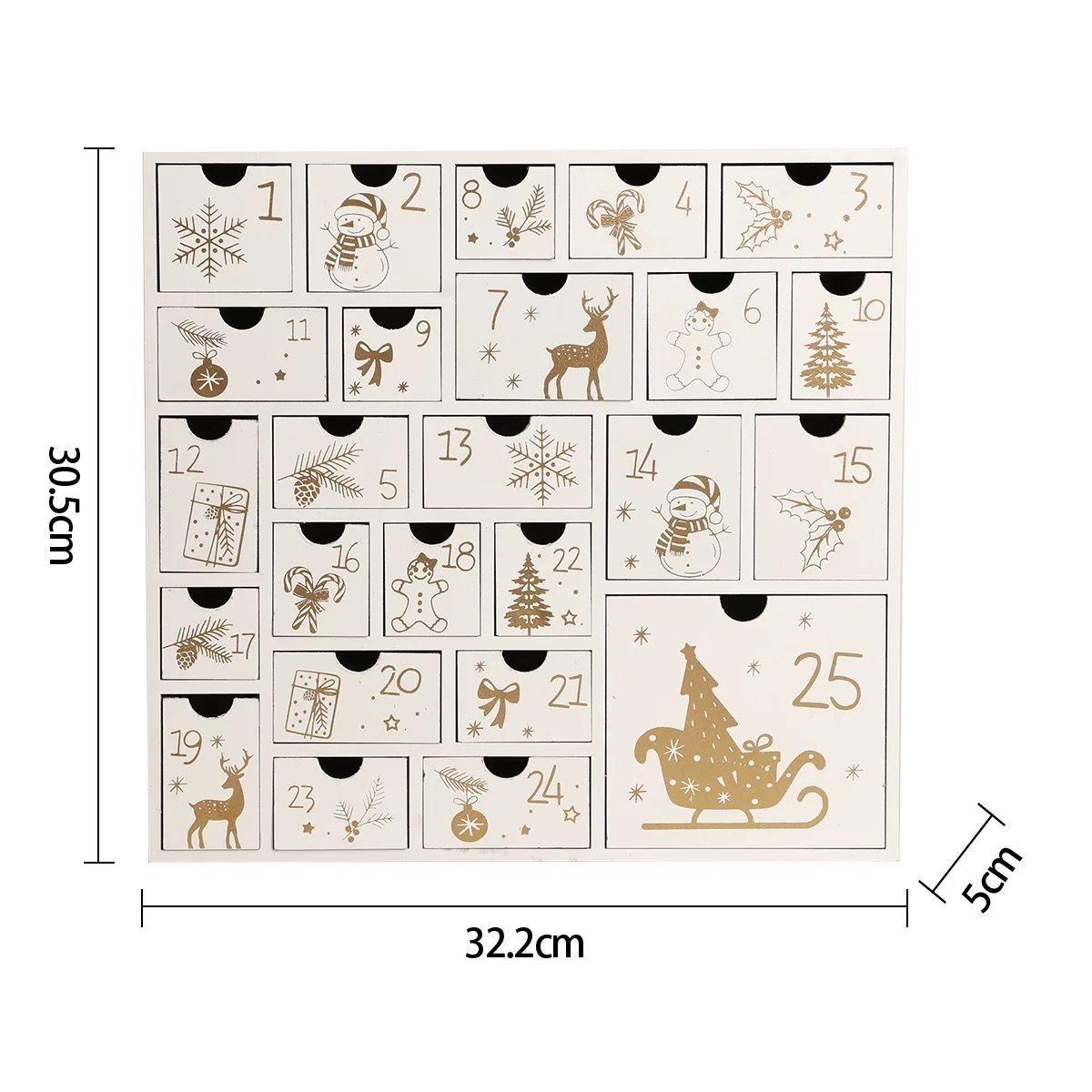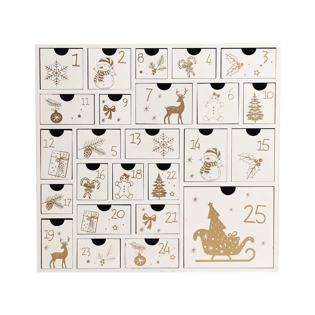 Add a touch of elegance and joy to your Christmas with this White Wooden Christmas Advent Calendar. Adorned with rich gold patterns of snowmen, pine trees, elk, and snowflakes, this beautiful countdown calendar is designed to bring festive magic into any room. With 25 drawers for each day leading up to Christmas, it offers a fun, interactive way to celebrate the holiday season!